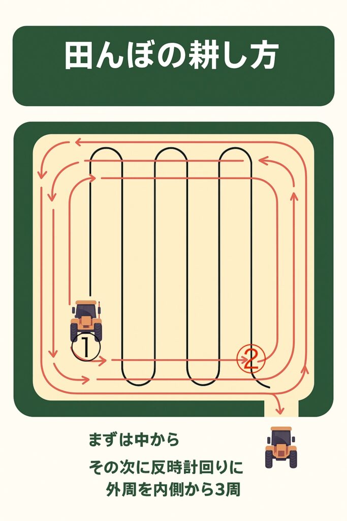 ①端からトラクターの幅三台分を残して中を上下に ※注意点